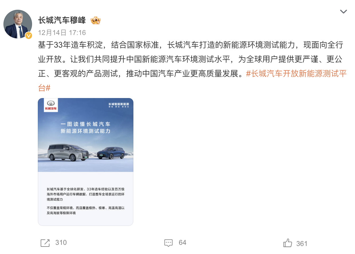 在懂车帝冬测开放日结束后,长城汽车则在其社交平台上表示,将向全行业开放新能源环境测试能力。随后在“共同提升中国新能源汽车环境测试水平圆桌论坛”上,长城汽车总裁穆峰表示:极限测试条件解决的是车辆的可靠性问题,常用测试条件则解决的是车辆经济性问题。
