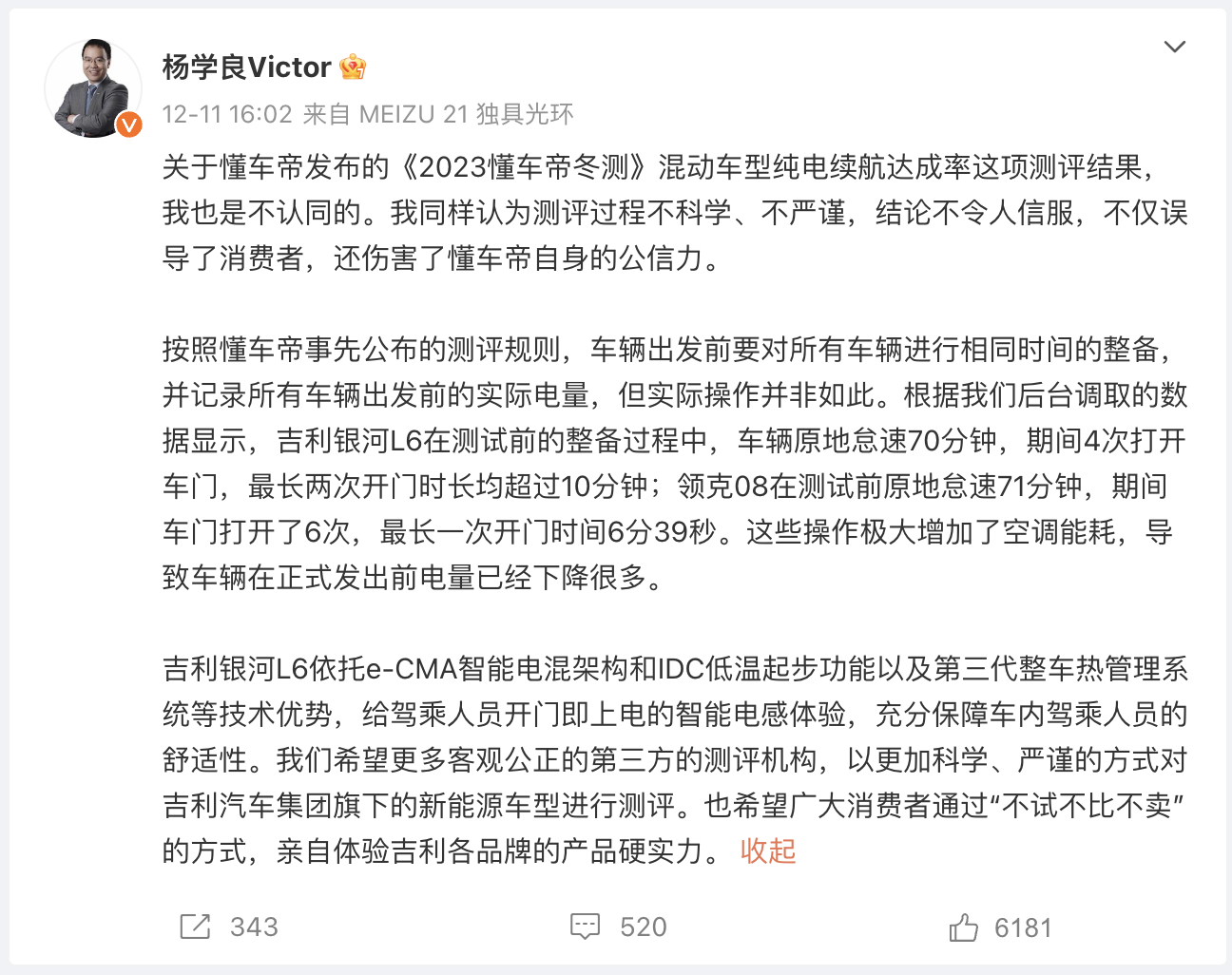 此前在懂车帝的新能源汽车冬季测试横评结果榜单中,其中备受关注的华为问界M7成绩几乎垫底,吉利和长城的排名也同样靠后。这引发了部分车企的不满,质疑懂车帝的测试方法和标准不够严谨。
