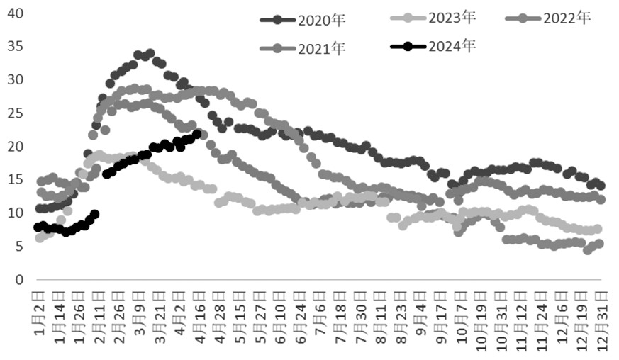 需求方面,中下游对高锌价存在畏高情绪,负反馈效应累积。尤其是作为锌消费大头的镀锌行业,受黑色市场价格影响较大。当前房地产市场依旧疲软,螺纹钢和热卷库存处于高位,下游需求不足,镀锌企业周度开工率为64.84%,同比偏弱,但光伏、铁塔出口订单较好,基建高频数据环比回升。汽车消费回暖,关注后续万亿元国债发力能否推动更多基建实物量落地。库存方面,截至4月16日,七地锌锭库存总量为21.8万吨,再次累库;上海地区进口锌锭持续流入,累库至10.26万吨。LME锌库存为258475吨,处于历史同期高位,海内外库存均去化缓慢。
