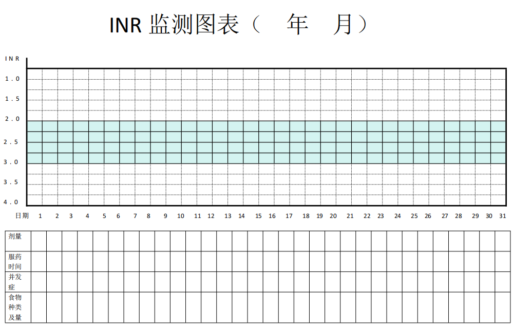 INR监测的重要性是不容置疑的,这里我们也推荐一些监测INR的小妙招。妙招一,建立一个INR监测图表(如图1),把您每一次的INR数据画一个小圆点登记在表格上的相应位置,并把每一次的小圆点连成线,如您的线段控制在蓝色范围内说明您INR控制佳,如超出了蓝色范围说明您本次INR控制有误,需及时找出原因进行调整,此外您还可以在表格上记录您每日用药的剂量、时间、食物种类和量及并发症,让您更直观地观察到各种因素对您INR的影响,也可在就医时让医生一目了然您近况并方便对您进行药物调整及治疗。随着科技的发展,目前也开发了许多华法林抗凝小程序,如您在微信小程序中搜索“华法林抗凝”字样,就会跳出一系列抗凝管理小程序,您可以选择适合您的小程序进行一个华法林抗凝的管理。妙招二就是现场即时检测(point-of-care test,POCT)INR技术,目前主流INR检测方法还是去医院进行静脉血的采集与检验,但医院人流量大,对于搞不清就医流程的老年人及对于心脏瓣膜病术后处于伤口疼痛且又要频繁监测INR的患者来说是十分不便利的,现在市面上有推出血凝检测仪,使用方法和测血糖一样,初次使用需要和静脉血的INR值进行校准,此后只需一滴指尖血就能得出您的INR值,它的操作之简便、快速与准确大大提高了患者的INR监测舒适度、体验感及依从性。