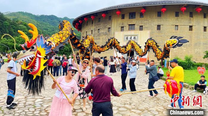 除了别出心裁的沉浸式婚嫁表演,财盛证券振成楼外的“双龙戏珠”也吸引了许多游客驻足观看,并参与其中。楼外互动,楼内参观,听客家楹联和客家家训文化的深刻内涵让“五一”期间的永定土楼充满了韵味。