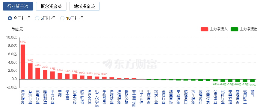行业资金方面,截至午间收盘,医疗服务、石油等净流入排名靠前,其中医疗服务净流入8.3亿元。
