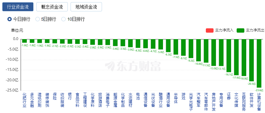 净流出方面,计算机设备、软件开发等排名靠前,其中计算机设备净流出23.6亿元。