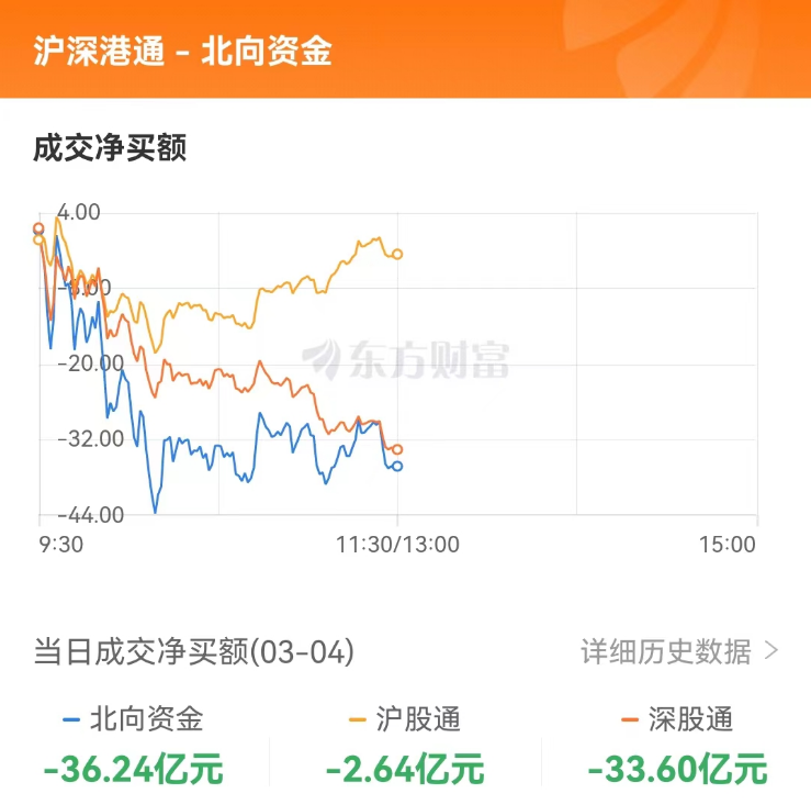 截至午间收盘,北向资金净流出,其中沪股通净流出2.64亿元,深股通净流出33.60亿元,合计净流出36.24亿元。
