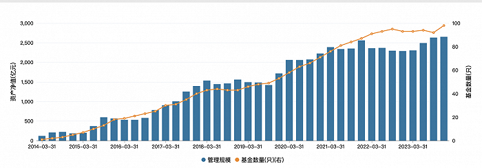 国寿安保基金自2013年末成立以来,管理规模呈攀升态势。Wind数据显示,截至最新,国寿安保基金在管基金规模达2651.93亿元。2023年,国寿安保基金管理规模逆势增长,主要得益于固收。39只债券型基金,合计规模为1238.76亿元;7只货币型基金,合计规模达1239.50亿元。35只混合型基金规模合计88.32亿元,14只股票型基金规模合计64.58亿元。